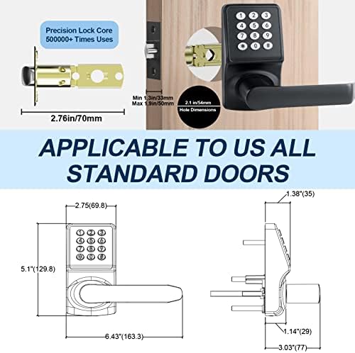 【Easy to Installation】Keypad door lock with handle is suitable for door thickness: 1-3/8'' to 2-1/8'' (35 to 55mm). Adjustable latch: 2-3/8 inches to 2-3/4 inches (60 to 70 mm).keyless entry door lock is easy to install with a screwdriver(Included) in a short time, just by following user manual or short installation video.